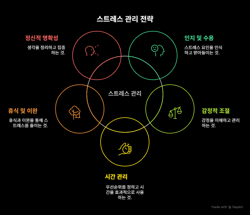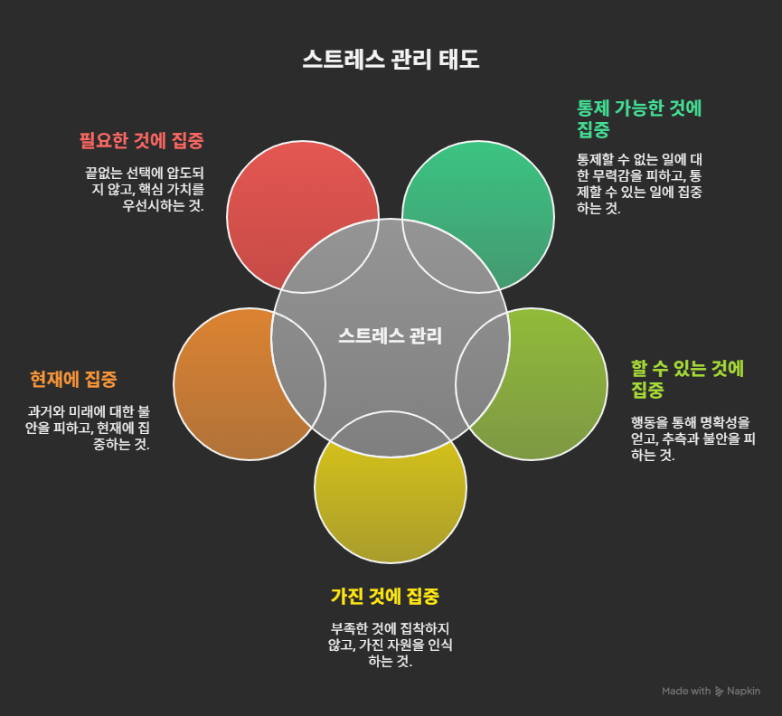 - 스트레스의 원인 중 많은 것이 ‘시간 관리’임. 우선순위를 파악하고 이를 활용해 목표를 설정하는 것만으로, 통제감과 회복력이 높아짐. 일에 앞서 삶의 가치와 우선순위를 살펴보고, 이에 따라 일정을 조절하면 좋음.